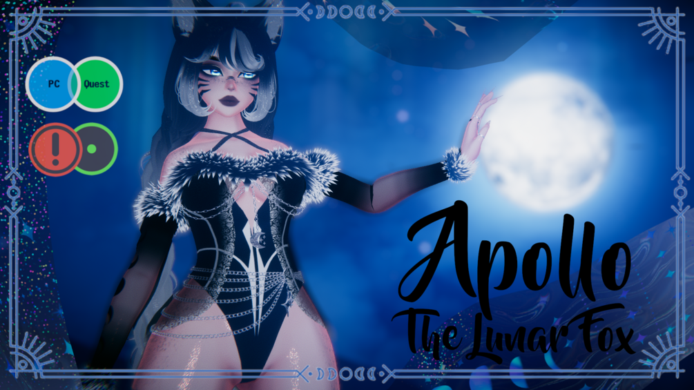 | Body by Pandaabear#9873 (EDITED BY ME, NO REUSE) | Head/Head Textures by DUCC#0008 (EDITED BY ME, NO REUSE) | Main Body Texture and Face Stripes by Ying#6669 (EDITED BY ME, NO REUSE) | Hair Textures by Cicieaaa#7777 | Fluff's ToolBox | VRCFury Tool | GoGoLoco by Franada | Glasses by kri#1214 | Rings by xSnail#2902 | All Hairs by @NESSYY.(EDITED BY ME, NO REUSE) | Fake Index by Milkers~#4457 | Moon Glasses by imnoteva | Comfy Set by AskAmber | One Sleeve/Leggings by milkuwu | Short Hair by Saikura | Braids by @NESSY! | Lunar Bodysuit, Heels, Sleeves, Socks, Sheer Top, and Cross Bodysuit by Deimos | Ears and Tail by JinxieWinks | Moon Bodychain by Aantara | Addt'l Hair Textures by WetCat | Strap Heels by renipuff | Silks by GM | Star Chain Belt by Anteofthecosmos | Thigh Highs by Darcy.fbx | Bikini by The Oasis |
