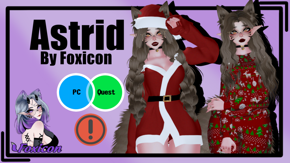 | Body by Pandaabear#9873 (EDITED BY ME, NO REUSE) | Head/Head Textures by DUCC#0008 (EDITED BY ME, NO REUSE) | Main Body Texture and Face Stripes by Ying#6669 (EDITED BY ME, NO REUSE) | Hair Textures by Cicieaaa#7777 | Fluff's ToolBox | VRCFury Tool | GoGoLoco by Franada | Glasses by kri#1214 | Rings by xSnail#2902 | Glasses by nini | All Hairs by @NESSYY.(EDITED BY ME, NO REUSE) | Fake Index by Milkers~#4457 | PJs and Santa Dress by @berryvee | Collar by rinebean#1111 | Christmas Hat by cupkake | Snowflake Pasties by Empress Moon#6969/Empress Moon | Panties by loki#3000 | Tails by Ourse#6842 | Boots by Zioketski | Socks by Valenti Doll | Ears by zinpia |