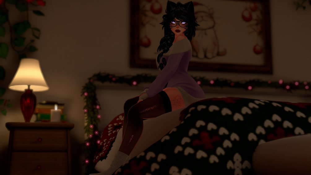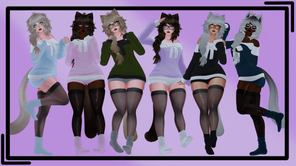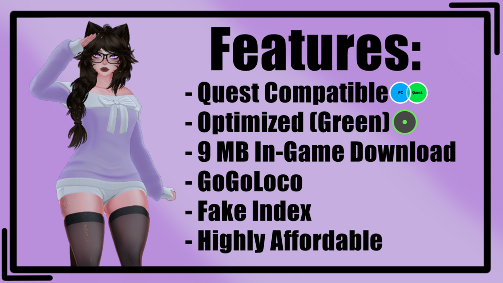 | Body by zinpia (EDITED BY ME, NO REUSE) | Head/Head Textures by DUCC#0008 (EDITED BY ME, NO REUSE) | Hair Textures by Cicieaaa#7777 | Fluff's ToolBox | VRCFury Tool | GoGoLoco by Franada | Hair by Minki | Sweater by Skeletib | Shorts by Skeletib | Thigh Highs by Whituu | Socks by Zammy3d | Glasses by Salted |