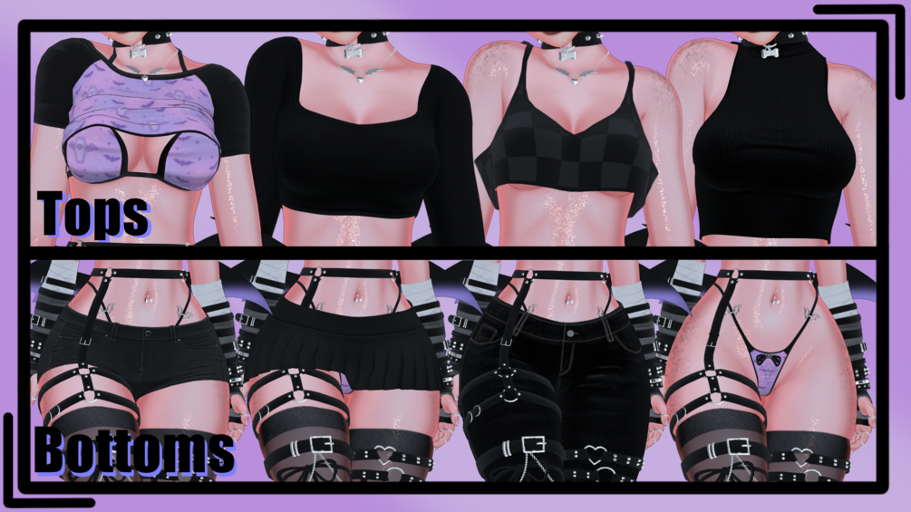♡ | Toggles: Bat Crop Top, Bra, Turtleneck, Loose Tank, Long Sleeve, Shorts, Jeans, Skirt, Panty, Goth Boots, Converse, Heels, No shoes, Cardigan, Crop Hoodie, Short Hair, Ponytail, Long Hair with/without bangs, Puppy Ears, Dog Ears, Puppy Tail, Dog Tail, Elf Ears, Horns, Wings |
