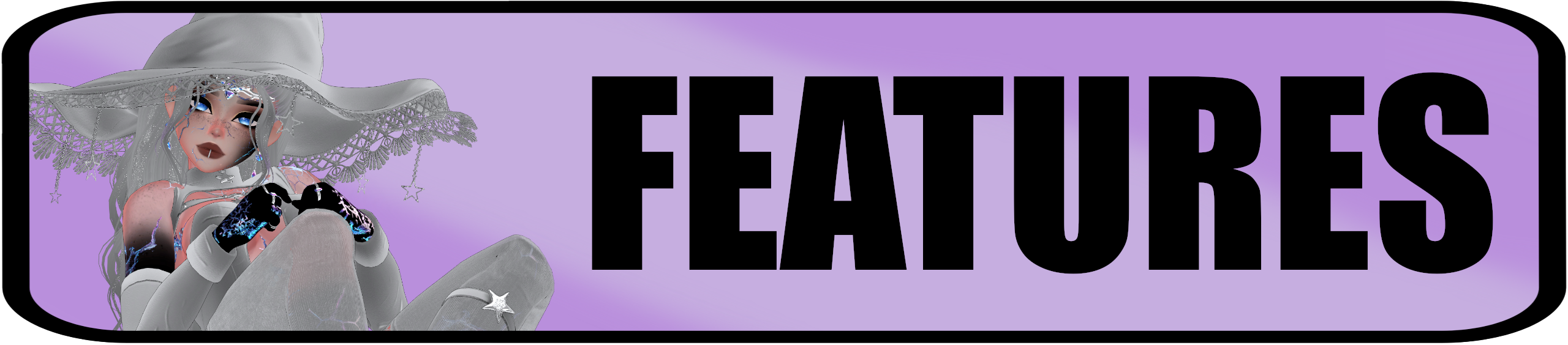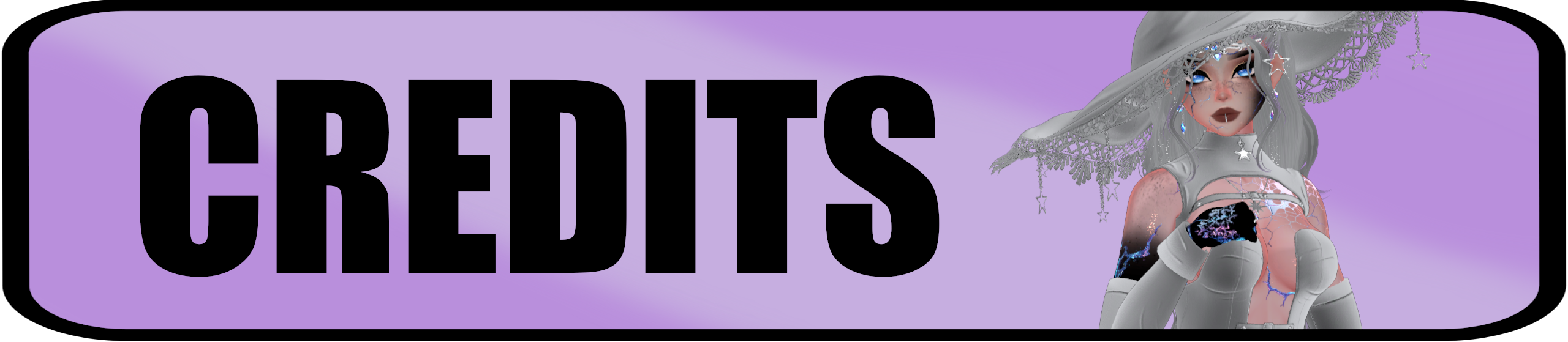 | Body by Pandaabear#9873 (EDITED BY ME, NO REUSE) | Head/Head Textures by DUCC#0008 (EDITED BY ME, NO REUSE) | Main Body Texture by Ying#6669 (EDITED BY ME, NO REUSE) | Hair Textures by Cicieaaa#7777 | Fluff's ToolBox | VRCFury Tool | GoGoLoco by Franada | Earrings, Toe Ring, Stockings, Rings by Aika | Necklace by Koragira | Circlet by Zeffyr | Belly Ring by Honeylabs | Up Do/Braid/Bun/Short Hair by Nessy | Eye Texture/Matcaps by Jvliette | Body Texture by France (HEAVILY EDITED, no reuse) | Fans/Portals by GM | Moon Staff by Aika | Hat, Collar, Tight Sleeves, Bodysuit, Skirt, Star Heels by Shuucheri | Boots by Meeva | Shorts, Top, Long Sleeve, Garter by Jule | Prop System by thatfatkidsmom | Unity Capture by Naudine | Pictures by Carnor | Toggle Showcase by Carnor |