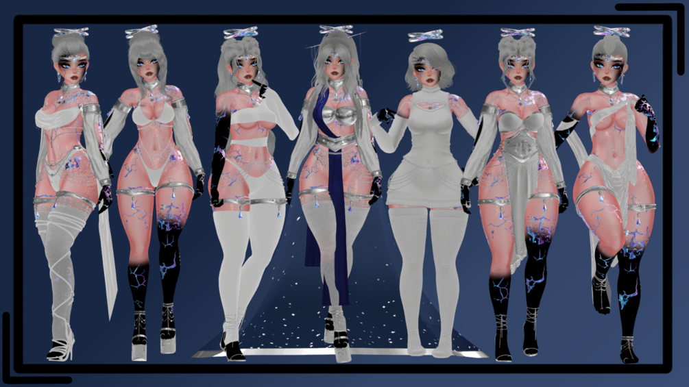 | Body by Zinpia (EDITED BY ME, NO REUSE) | Head/Head Textures by DUCC#0008 (EDITED BY ME, NO REUSE) | Main Body Texture by Ying#6669 (EDITED BY ME, NO REUSE) | Hair Textures by Cicieaaa#7777 | Fluff's ToolBox | VRCFury Tool | GoGoLoco by Franada | SPS by wholesome | Armor Bra, Panty, Belt, Sleeves, Earrings, Toe Ring, Drape, Choker, Garter, Stockings, Thigh Highs, Rings, Panty by Aika | Necklace/Pasties by Koragira | Circlet/Halo by Zeffyr | Shoulder Chain by Wylo | Hip Chain by RioletTV | Belly Ring by Honeylabs | Hera Heels by Khihani | Tied Heels by Ares | Up Do/Braid/Bun/Short Hair/Hair Pin | Sun Dress by LoloVRC | Valkyrie Hair/Tied Dress/Draped Fit/Strap Heels by CompelledInk | Bodysuit by @bakuuwu.vrc | Sweater Dress by apyr | Bikini by Yaoomi | Skirt by LoveCrusty | Eye Texture/Matcaps by Jvliette | Body Texture by France (HEAVILY EDITED, no reuse) | Sparks by Robo | Fans by GM | Star Trails by Phawksea | Squishy Fidet by MysticsBoutique | Avatar Showcase by @MeltedSlushie | Photography by Crazygirl2591 | Photography by Seraph | Toggle Showcase by Carnor |