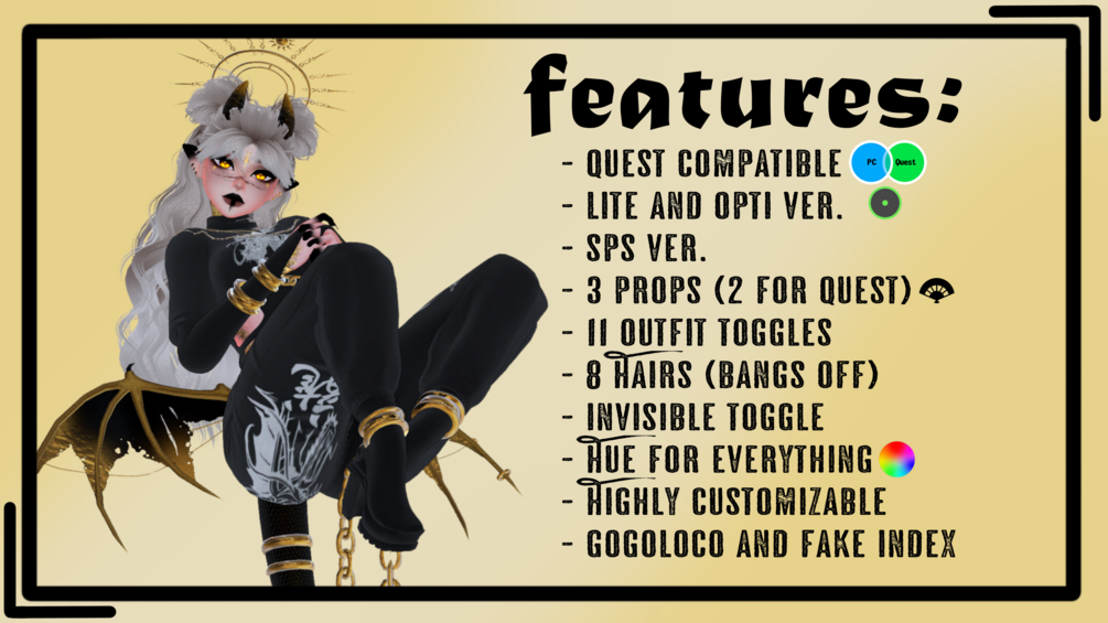 | Body by Pandaabear#9873 (EDITED BY ME, NO REUSE) | Head/Head Textures by DUCC#0008 (EDITED BY ME, NO REUSE) | Main Body Texture by Ying#6669 (EDITED BY ME, NO REUSE) | Hair Textures by Cicieaaa#7777 | Fluff's ToolBox | VRCFury Tool | GoGoLoco by Franada | SPS by wholesome | Comfy Bodysuit/Pants by PettyStore | Pants by Nguerra | Sun Halo by Empress Moon | Feather Fans by Hanee_Bee | Body Scales by Meyah (Face Tex by Foxicon) | Aureate Marks by Druidliss | Chain Heels by millkox | Sleeves by Kenvi | Cuffs, Wings, Tail, Horns by FormulaRats | Shoulder Chain by Wylo | Hip Chains by Ryafalls | Chest Metal Piece by LoloVRC | Necklace by KingShai69 | Down Hair, Braids, Bun by Nessy | Earrings by Hyacinth | Face Jewelry by Jellyvrc | Half Up Hair by Saikura | Sunbeam Fans & Cloud Portal Ribbons by GM | Main Bodysuit/Dress/Garter/Heels/Belt Sleeves/Belt/Belt Dress/Belt Socks by Darcy | Chunky Heels by Gashina | Sheer Bodysuit by Loki's Vanity | Infinity top by Nauuki | | String Swimsuit by Confuse | Cross Bodysuit by Deimos | Showcase by @MeltedSlushie | Photography by Crazygirl2591 |
